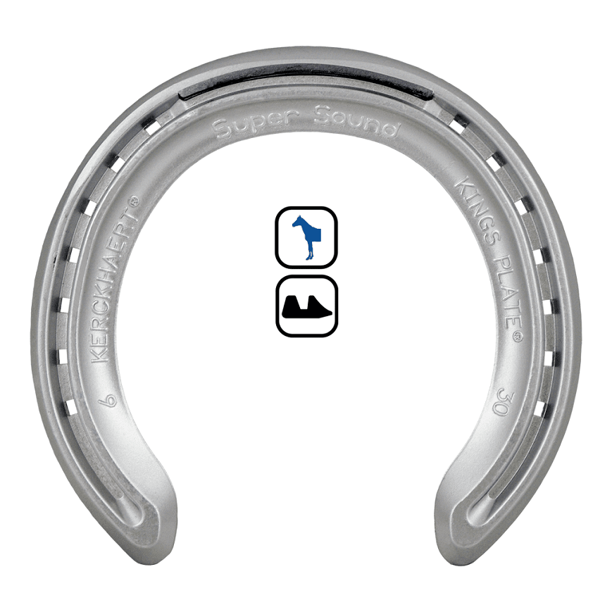 Alumíniumból készült kiváló minőségű lópatkó fém erősítéssel Alu Kings Plate Super Sound mellső lábakra, 1 kápával, méret: 4-28, hossz: 117 mm, széleség: 125 mm.