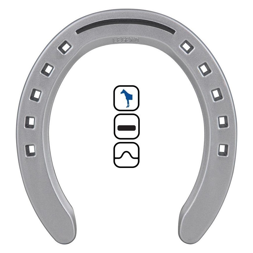 Alumíniumból készült kiváló minőségű lópatkó fém erősítéssel Alu Legend Flat 18x6mm, mellső lábakra, 1 kápával, méret: 3, hossz: 142 mm, széleség: 132 mm.
