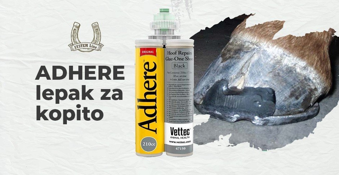 Adhere je brzo vezujući uretan lepak koji obezbeđuje snažno prianjanje za metalne, aluminijumske i sintetičke potkovice. Idealan je za situacije kada stanje kopita ne dozvoljava eksere ili kada konj ima problema sa šepanjem (hramanjem). Pravilna priprema kopita i potkovice je ključna za uspešno lepljenje.