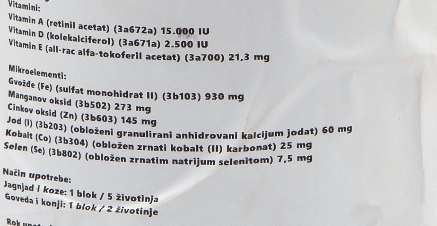 Nedostatak soli u ishrani životinja se lako nadoknađuje, a posebno pripremljeni blokovi soli za lizanje pouzdano obezbeđuju neophodne minerale. Stočna so za lizanje u blokovima treba da se daje životinjama prema uputstvu proizvođača. Osim blokova za lizanje, postoje vitamini i minerali u prahu koji se mogu mešati sa standardnom hranom za stoku.