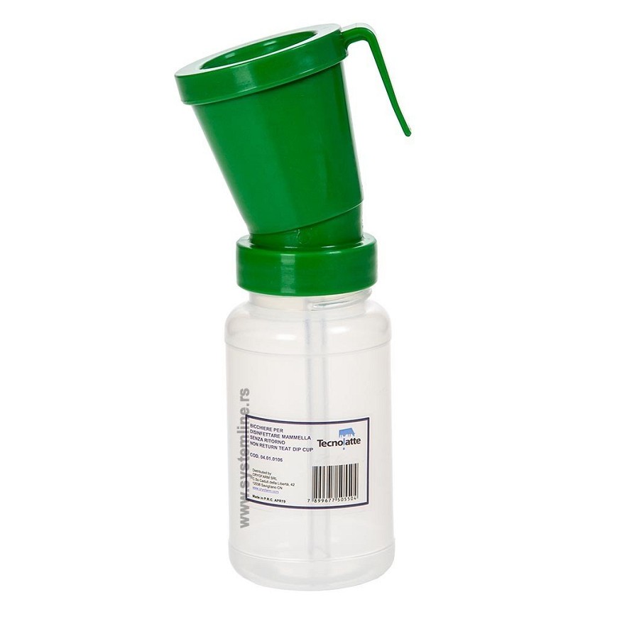 Čaša za dezinfekciju vimena posle muže zelena je nepovratna čaša za dipovanje, u rezervoaru ostaje čisto sredstvo, olakšava pranje vimena.