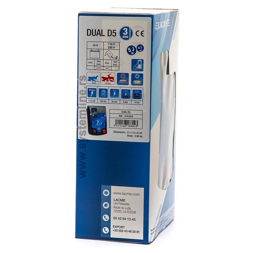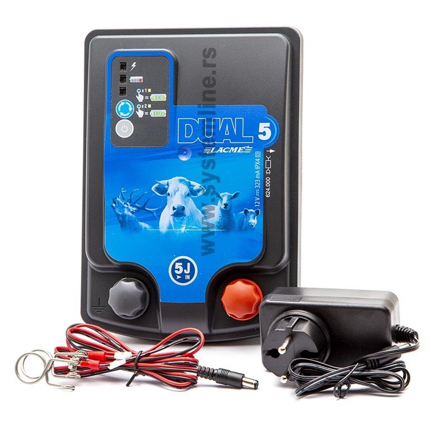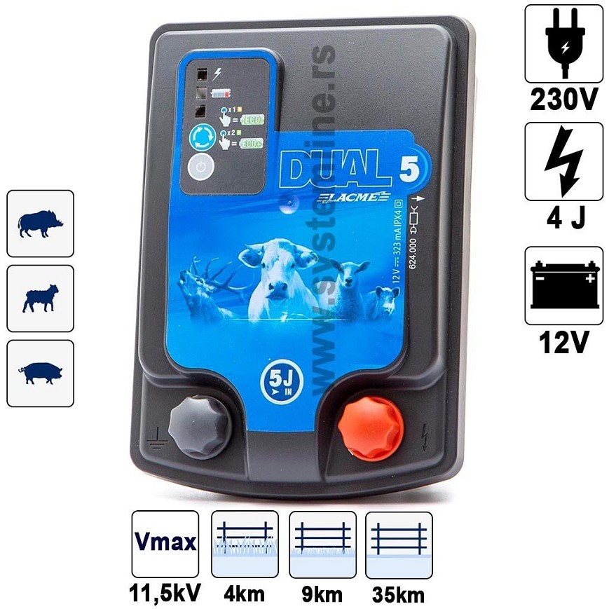Električni pastir Dual D5 je kombinovani uređaj koji može da radi na akumulator od 12 V ili na struju 230 V. Namenjen je za velike dužine ograde. Idealan je za čuvanje ovce. Uređaj ima ECO i ECO+ režim i zaštitu baterije.