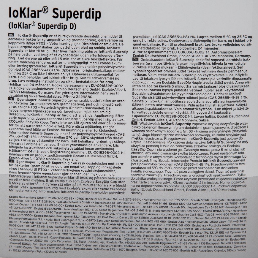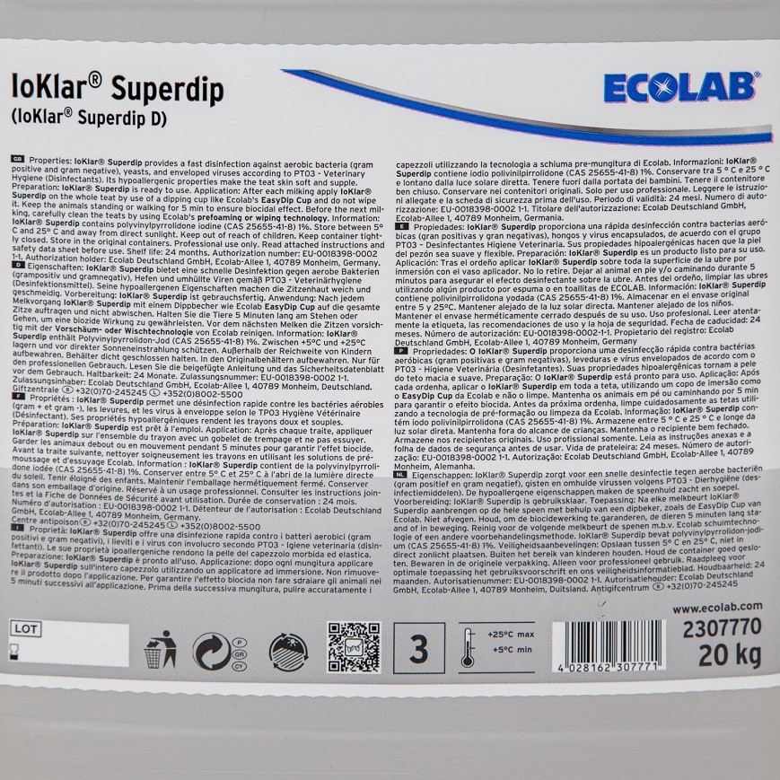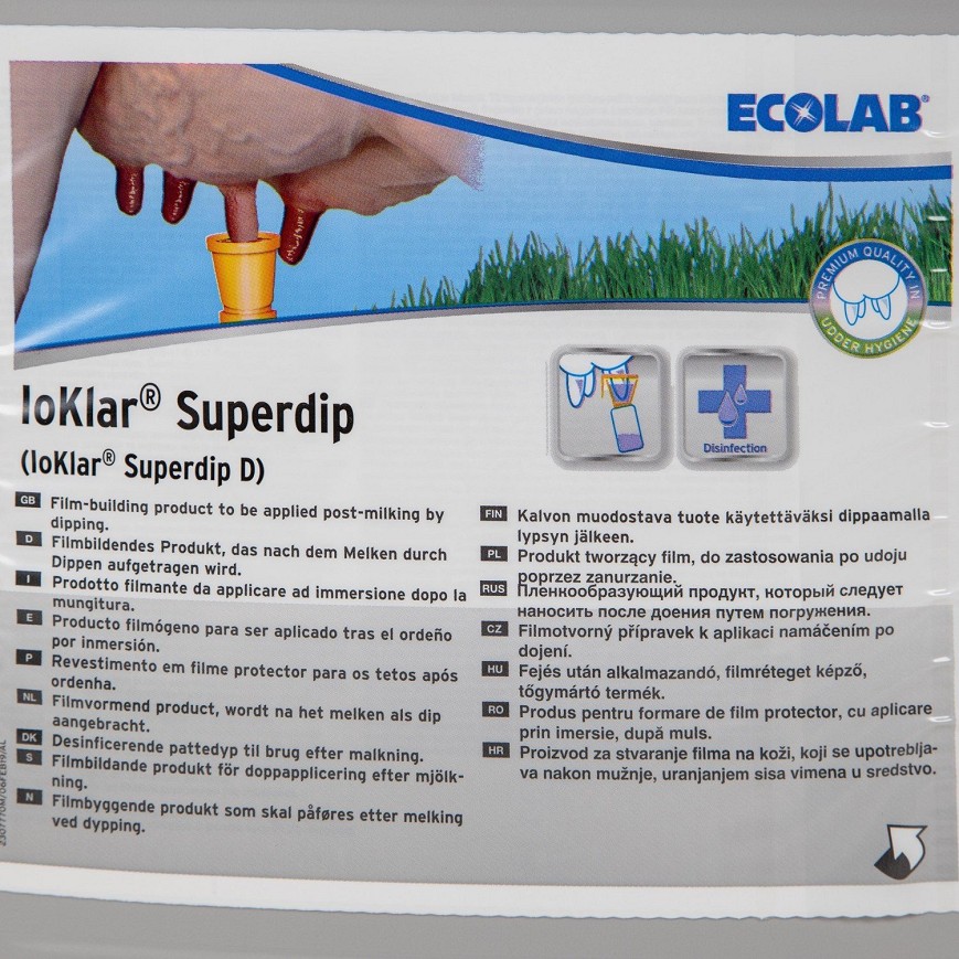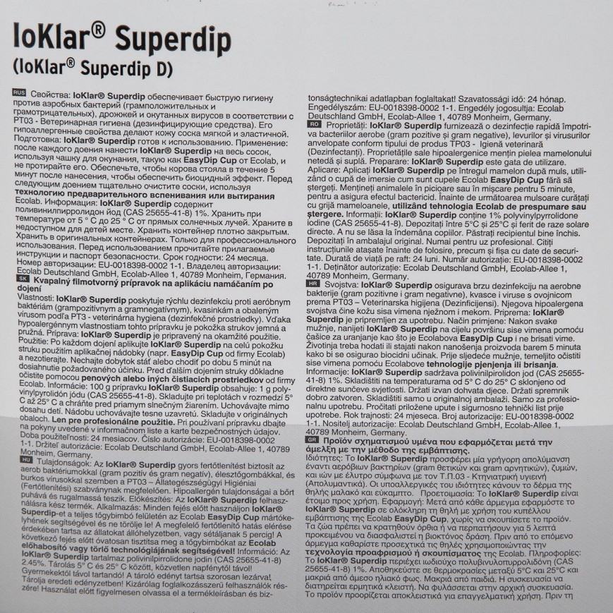 Ioklar Super Dip D 20kg sredstvo na bazi joda je namenjen za dezinfekciju i negu vimena posle muže formirajući uočljiv sloj joda na vimenu. U odnosu na ostala sredstva zaštite na bazi joda, ioklar superdip sadrži manje joda, ali zbog svoje viskoznosti bolje prijanja i stvara deblji sloj zaštite na vimenu. Ioklar superdip je dostupan u velikom pakovanju od 20kg što ga čini veoma ekonomičnim.