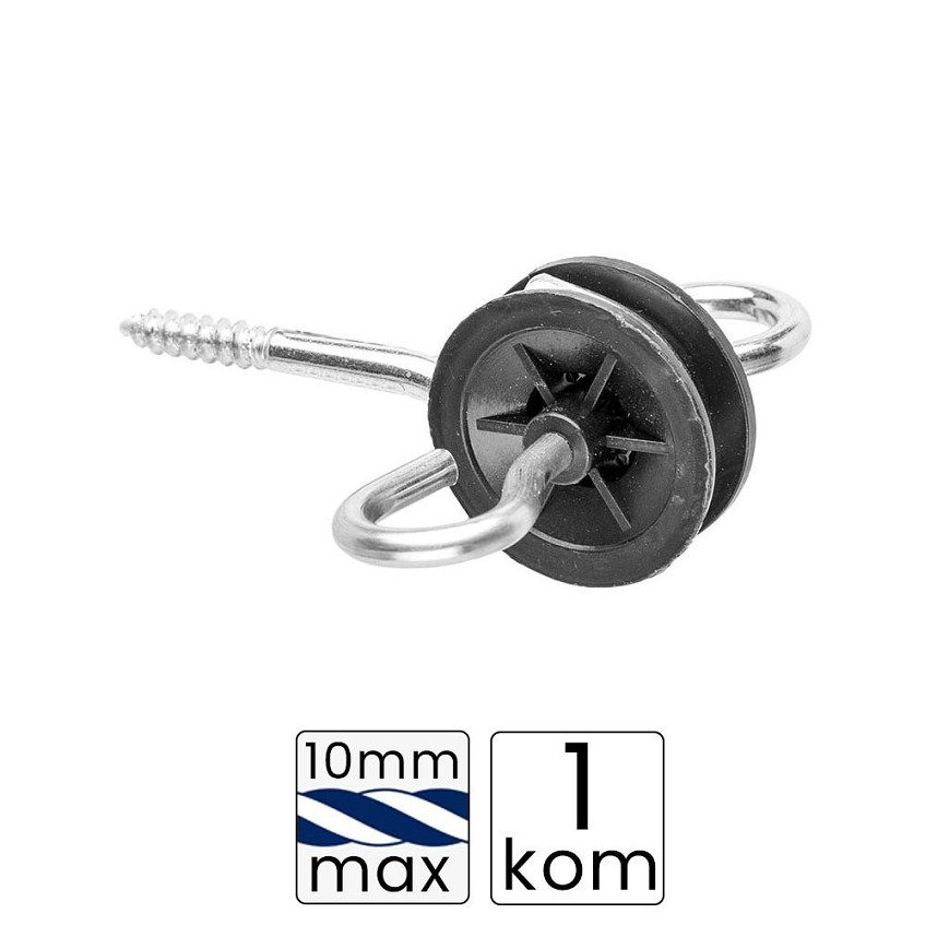 Izolator za kapije, namenjen za upotrebu kod električnih ograda. Robustan i čvrst izolator sa kukom sa obe strane, sa šrafom za drvo.