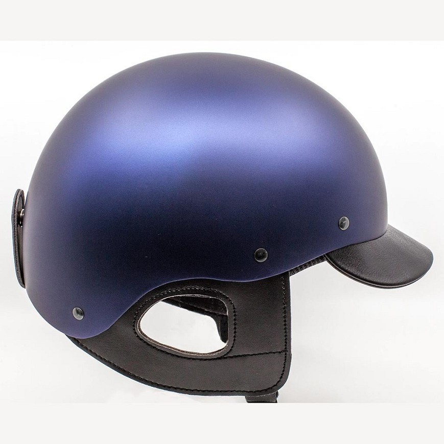 Elegantna kasačka kaciga sa plastičnim vizirom i zaštitom za uši od veštačke kože. Kopča ispod brade omogućava lako zatvaranje.