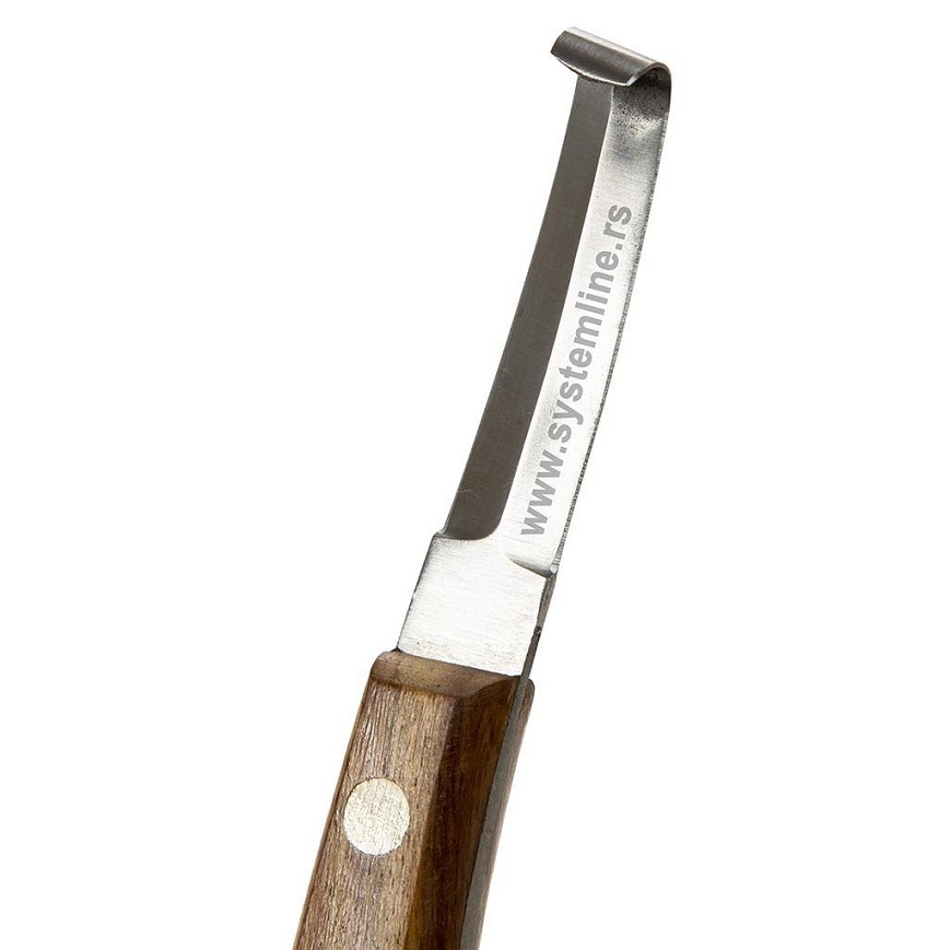 Nož za obradu kopita i papaka dvostrani desni profesionalni nož za obradu kopita. Sečiva je izrađen od specijalnog čelika predviđenog za sečiva. Zakrivljena oštrica pomaže u preciznom radu Ergonomična drvena drška.