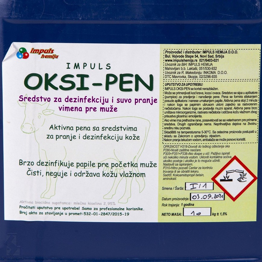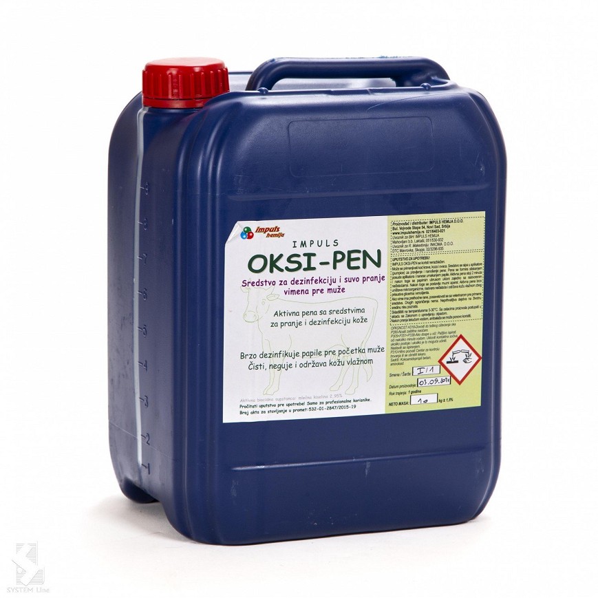 OKSI-PEN je tečno sredstvo sa višestrukom funkcijom. Primarne uloge sredstva su dezinfekcija pomoću aktivnog kiseonika i čišćenje čvrstih nečistoća i naslaga sa papila vimena. Površinski-aktivne materije koje ulaze u sastav sredstva su otporne na oksidaciju, pa ne postoji opasnost od njihove razgradnje od strane jedinjenja sa aktivnim kiseonikom.