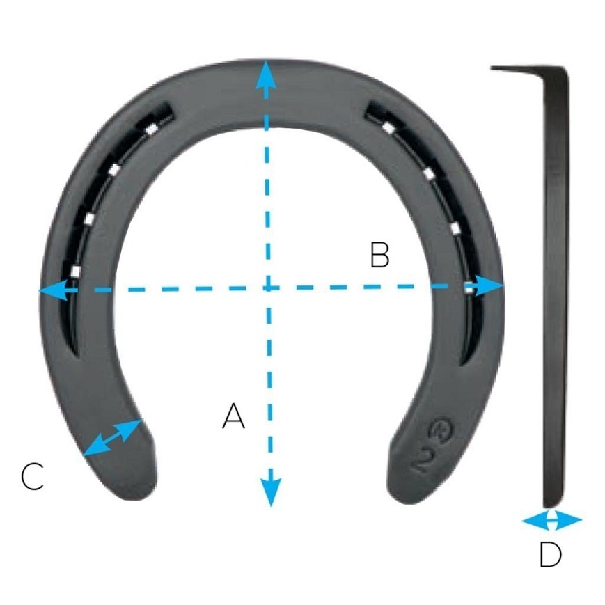 Aluminijumske potkovice sa metalnim ojačanjem za potkivanje konja Kings Plate Super Sound, prednje, sa 1 kapnom na prstu, veličina: 6-30, dužina(A): 130 mm, širina(B): 132 mm.