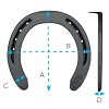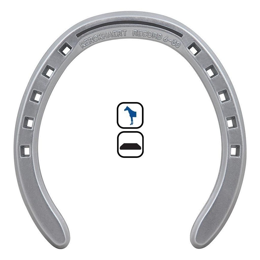 Aluminijumske potkovice sa metalnim ojačanjem za potkivanje konja Alu Record 14x4mm, prednje, bez kapne, veličina: 6-30, dužina(A): 140 mm, širina(B): 135 mm.