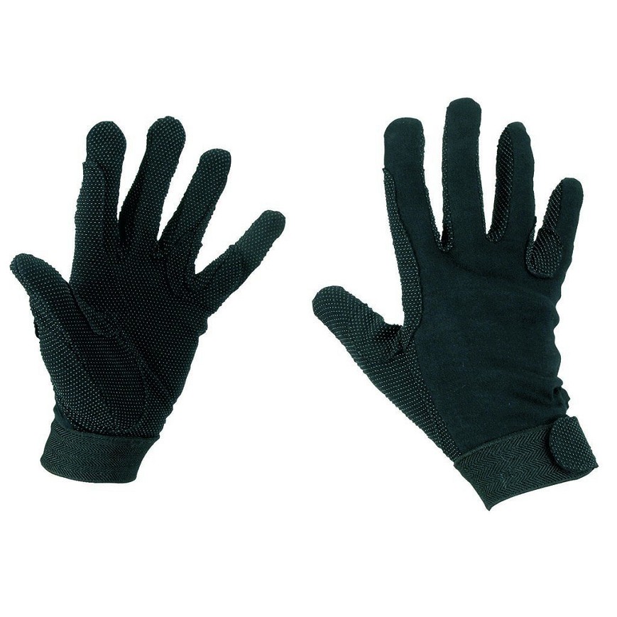 Lagane i udobne pamučne rukavice za jahanje u crnoj boji. Ergonomski dizajn, savršeno pristaje ruci. Ojačani i neklizajući na dlanu, sa čičak kopčanjem na zglobu.