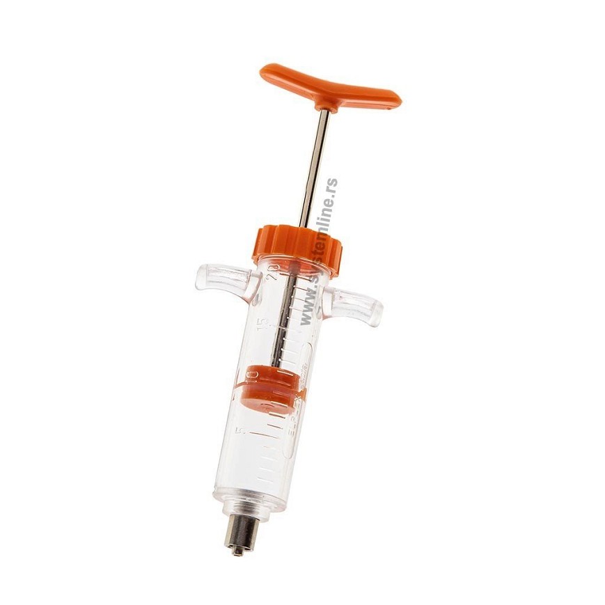 Špric 20 ml (Luer Lock) izrađen je od izdržljivog pleksiglasa, sa metalnom drškom i metalnim klipom, što obezbeđuje dug vek trajanja i precizno doziranje lekova. Namenjen je za jednostavno i sigurno davanje lekova, vakcina i drugih tečnih preparata kod različitih vrsta životinja.