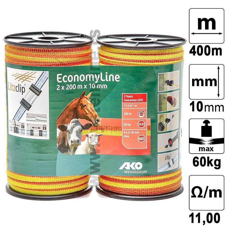 Traka za električnog pastira žuto-narandžasta 10mm 2x200m Economyline je napravljena od plastičnih vlakana za bolju zateznu čvrstoću, sadrži 4 metalnih povodnika koja provode struju. Otporan na UV, omogućava im duži životni vek. Ove trake su namenjene za upotrebu na kratkim ogradama sa malo vegetacije za domaće životinje, idealno je za konje. Jasno je vidljiv zbog svoje širine i žuto-narandžaste boje, odlikuje se visoko zateznom čvrstoćom.