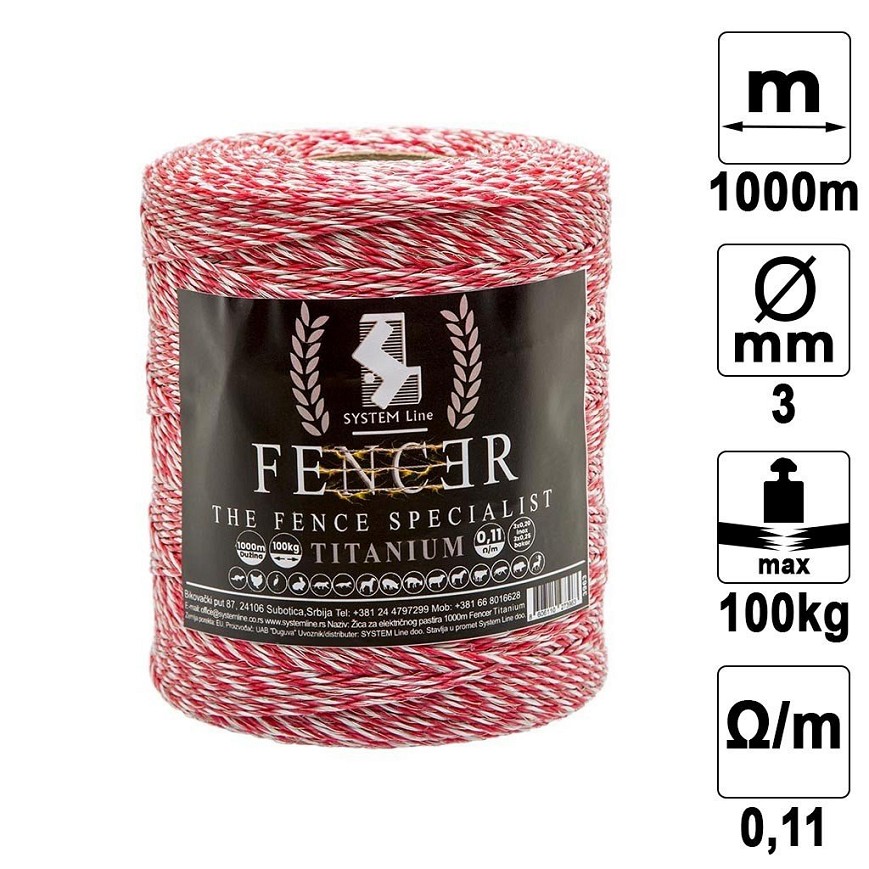 Žica za električnog pastira 1000 m Fencer Titanium je napravljena od plastičnih vlakana za bolju zateznu čvrstoću, sadrži 3 metalnih, 3 bakarnih povodnika koja provode struju. Otporan na UV, omogućava im duži životni vek. Ove žice su namenjene za upotrebu na dužim ogradama za domaće ili divlje životinje. Jasno je vidljiv zbog crvene - bele boje, odlikuje se visoko zateznom čvrstoćom.
