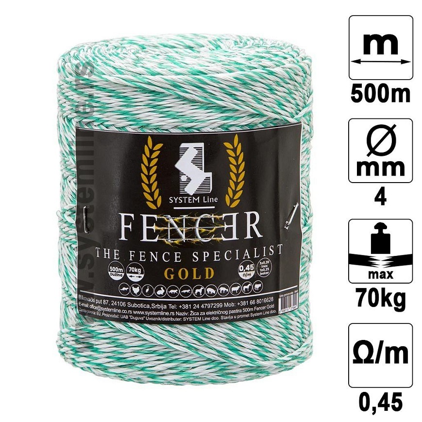 Žica za električnog pastira bela-zelena 500m Fencer Gold je napravljena od plastičnih vlakana za bolju zateznu čvrstoću, sadrži 3 metalnih, 1 bakarnih povodnika koja provode struju. Otporan na UV, omogućava im duži životni vek. Ove žice su namenjene za upotrebu na kratkim ogradama sa malo vegetacije za domaće životinje, idealno je za krave, koze i ovce.